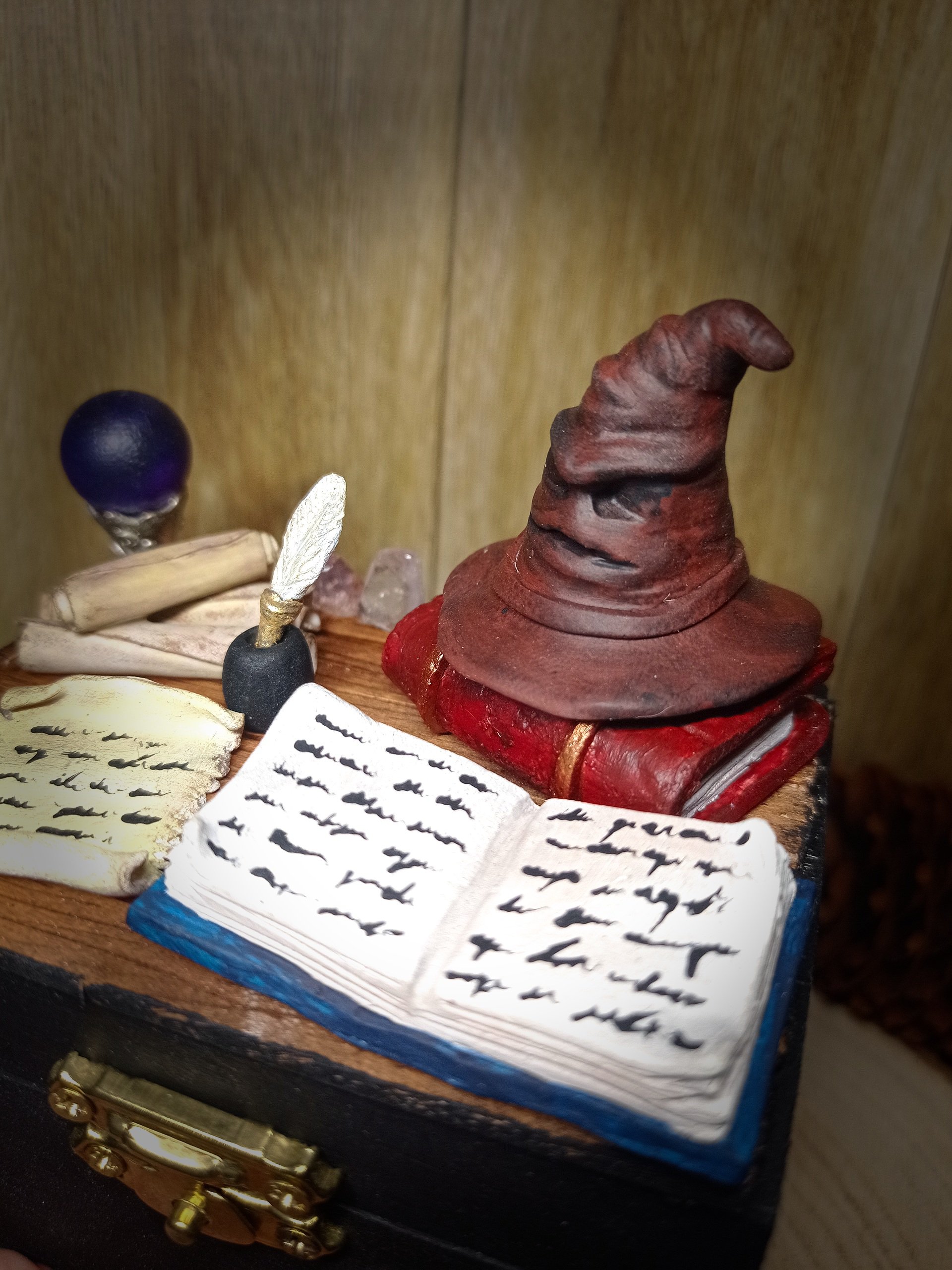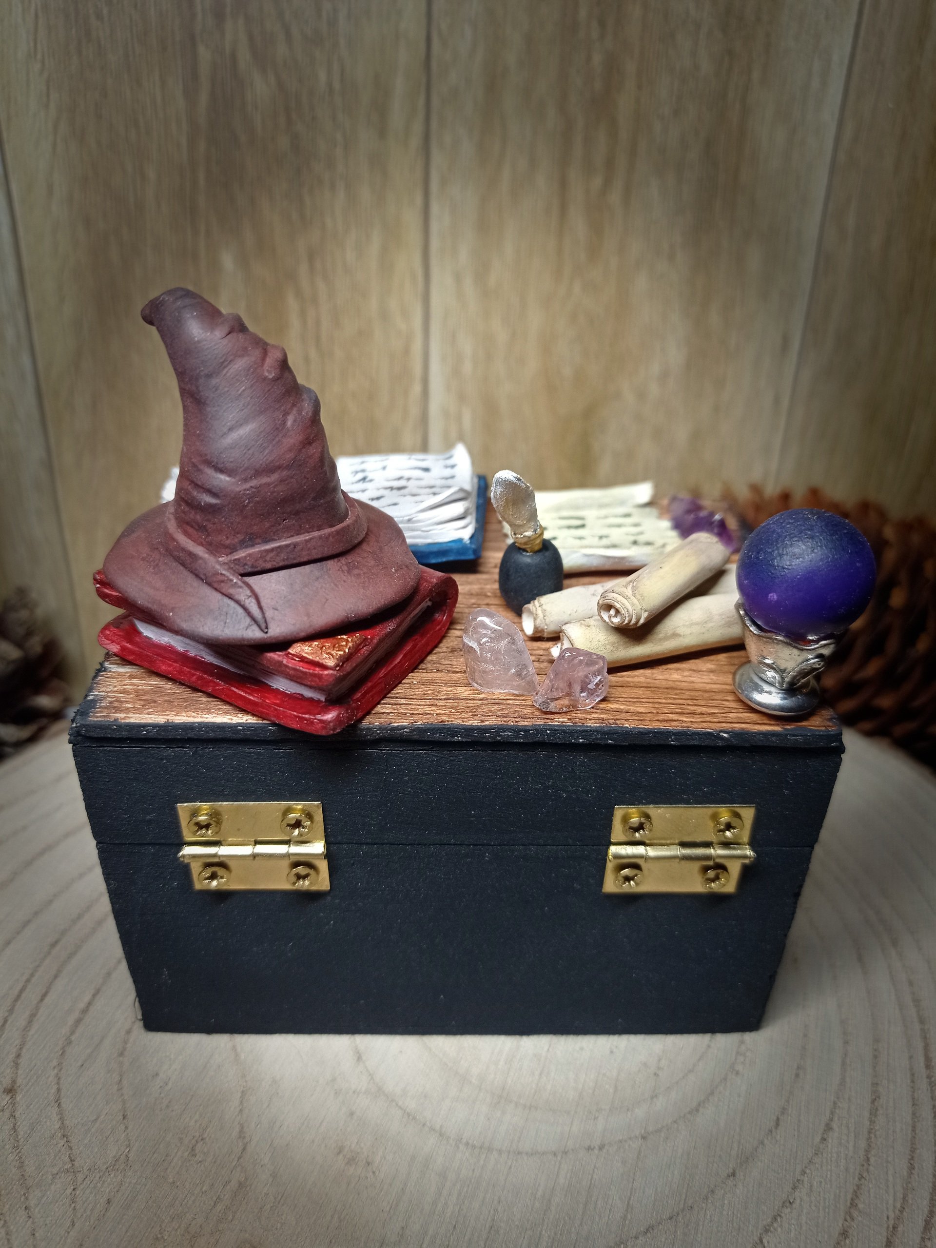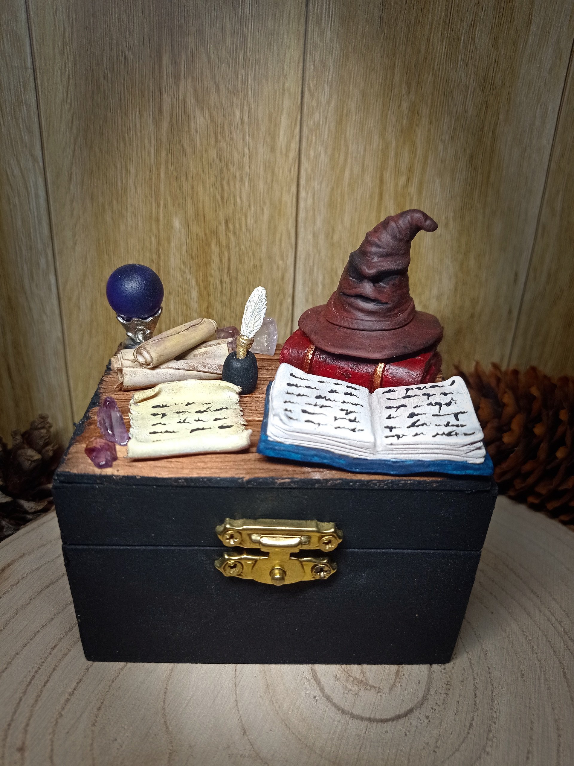 Boite en bois sur le thème Harry Potter avec différents éléments, dont le choixpeau magique, qui ont été sculptés dans de la pâte polymère et peints à l’acrylique. Il y a quelques éclats de cristaux également