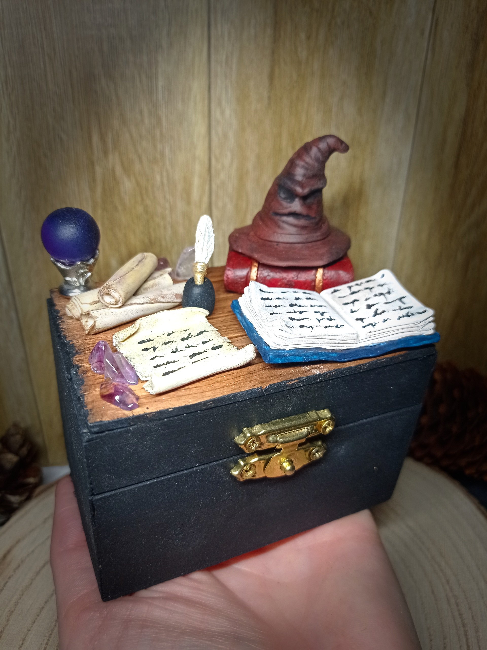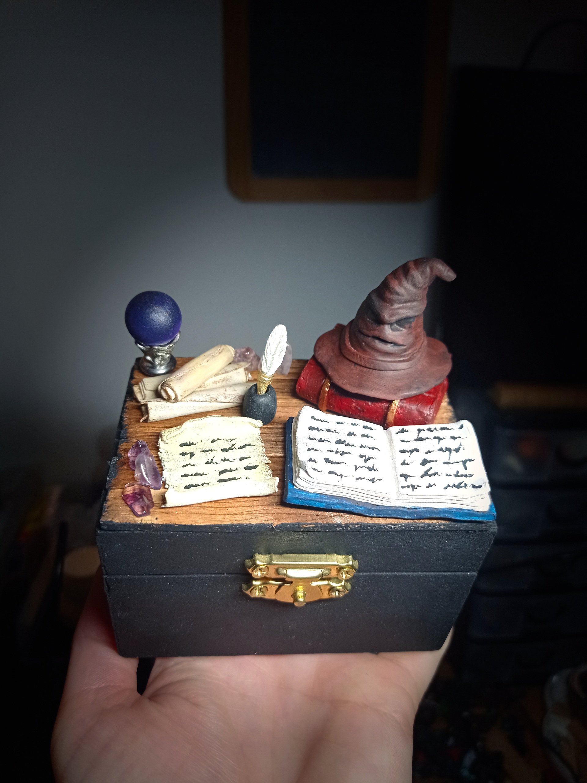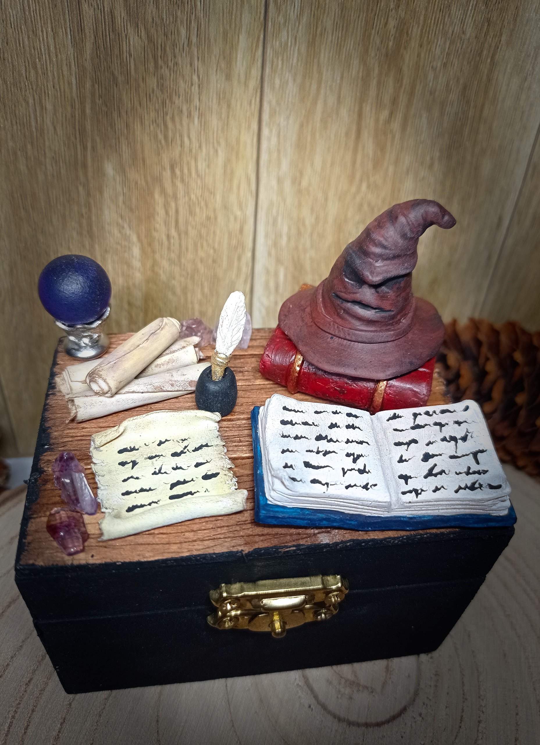Boite en bois sur le thème Harry Potter avec différents éléments, dont le choixpeau magique, qui ont été sculptés dans de la pâte polymère et peints à l’acrylique. Il y a quelques éclats de cristaux également