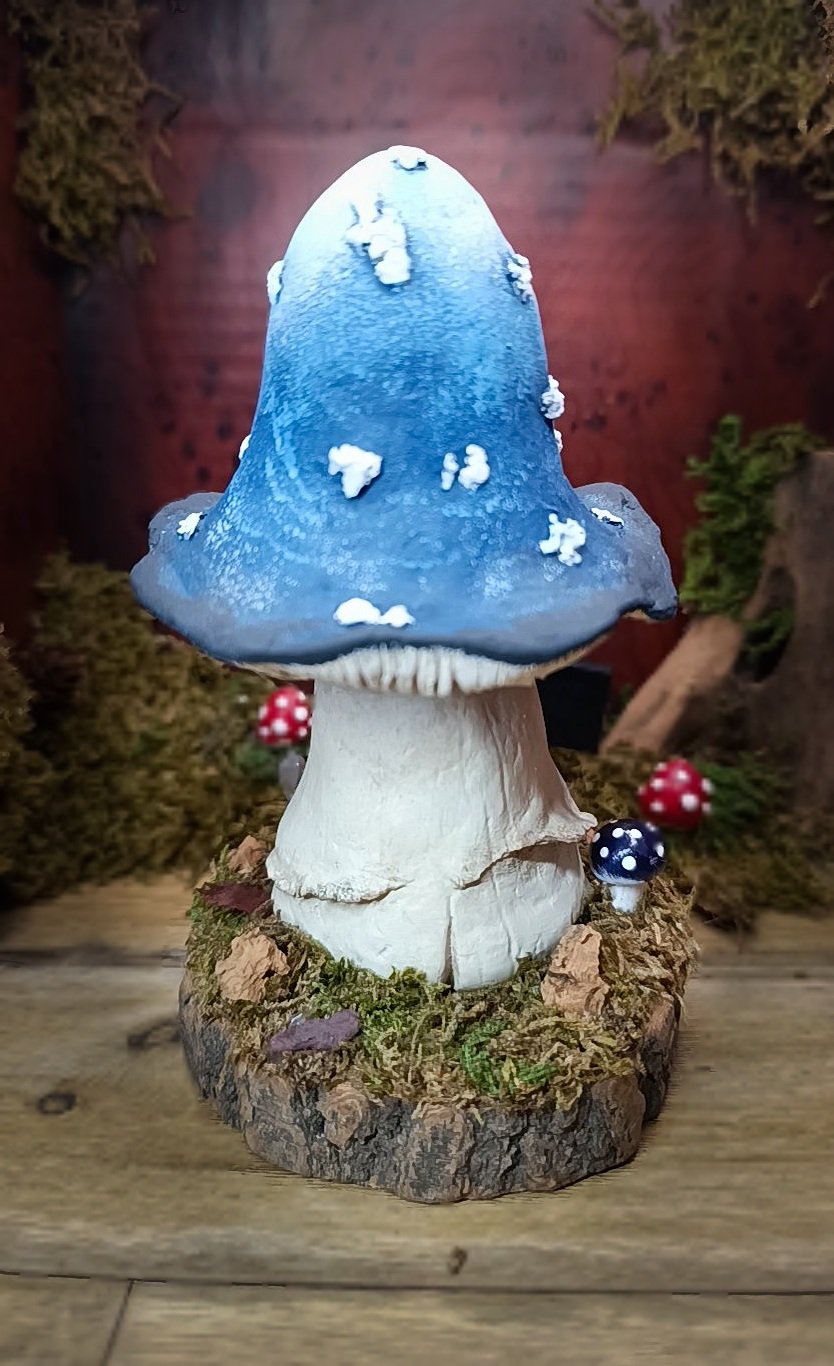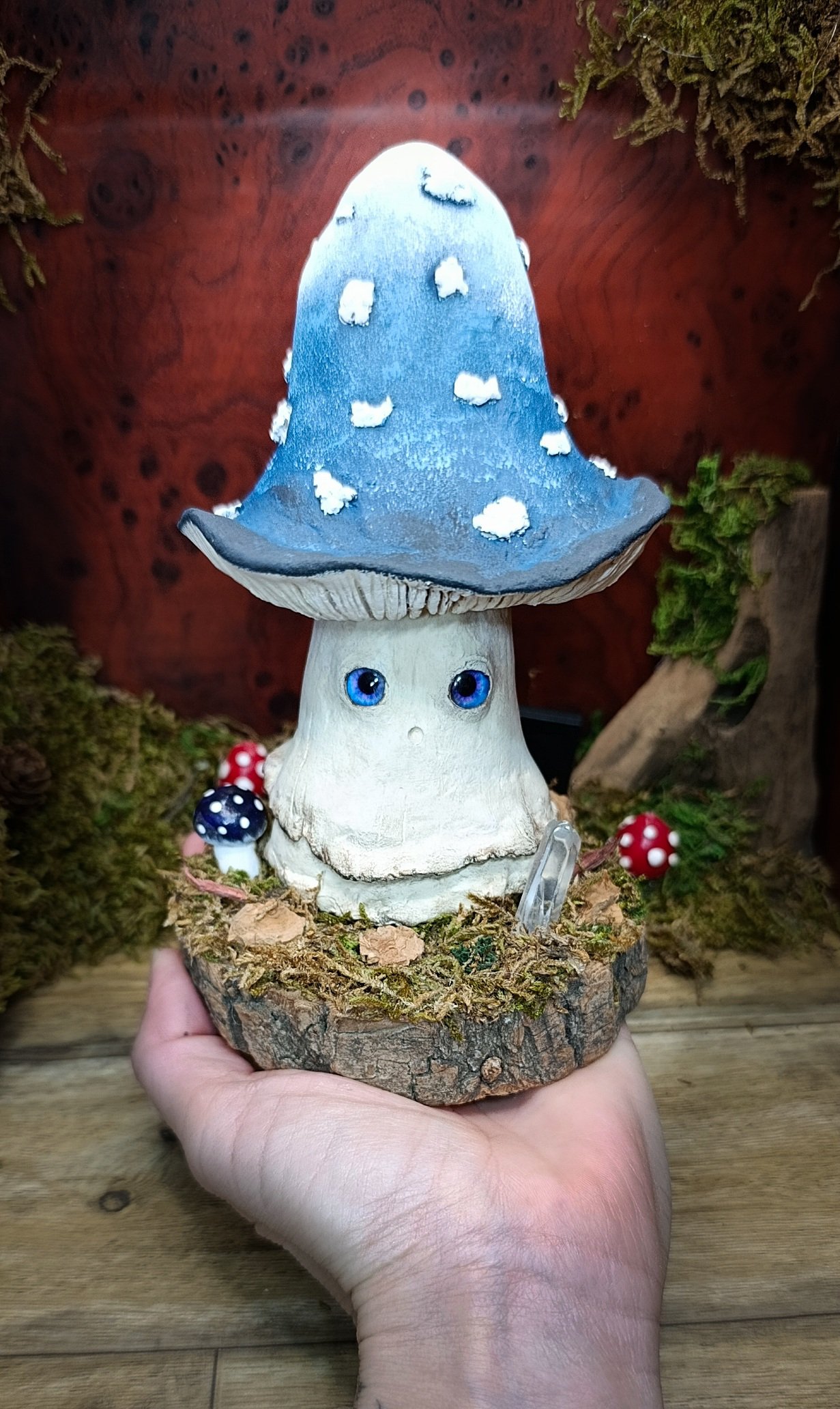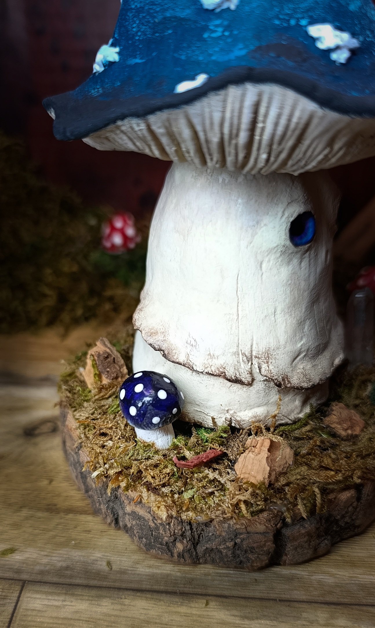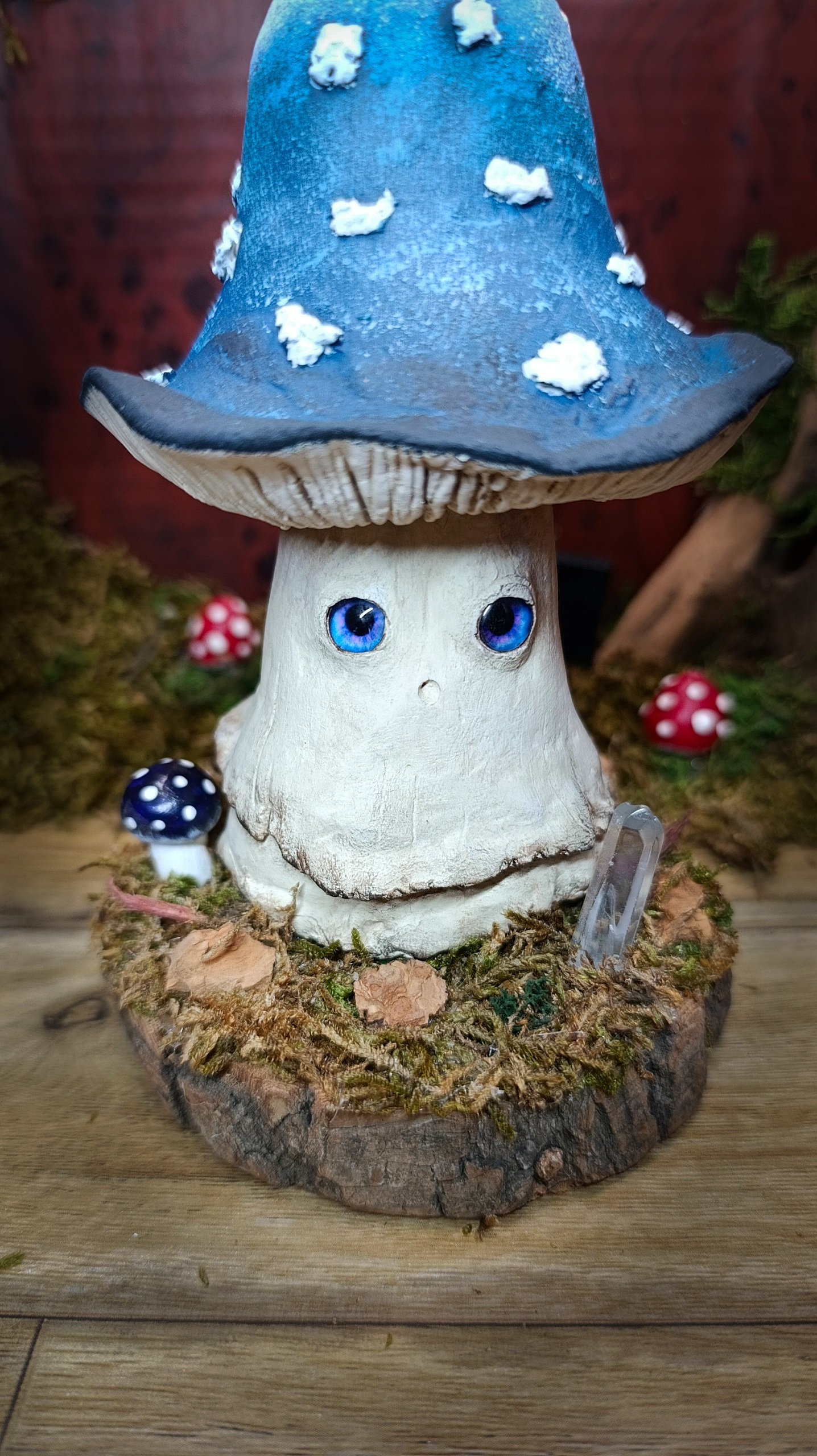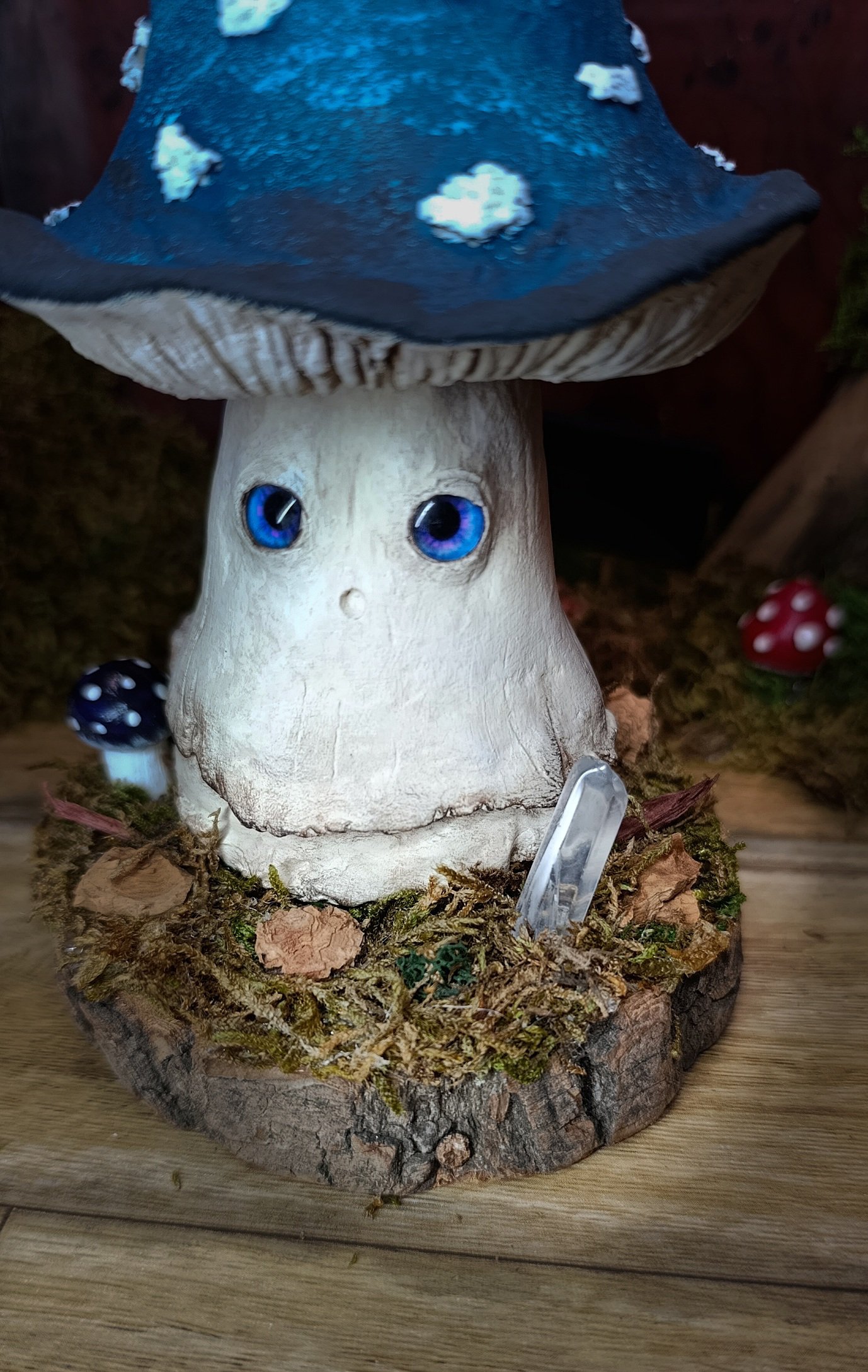 Chaque détail a été travaillé avec soin : la texture du pied, le dégradé du chapeau, le regard bleu, le socle naturel orné de mousse, de bois et d’un cristal.
