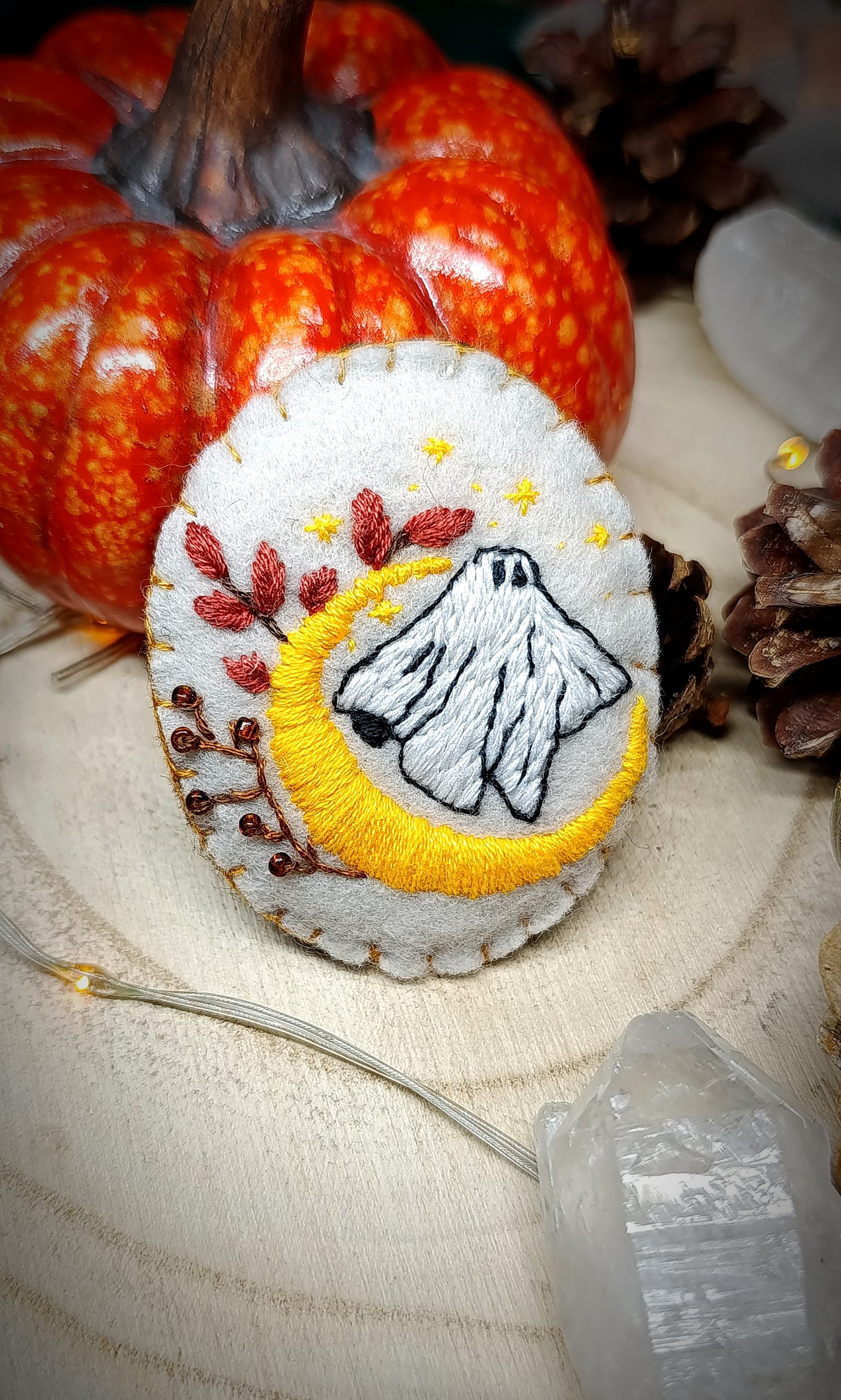 Avec ajout de petites perles de rocaille. Le fantôme est phosphorescent! (Voir photos) Pièce unique La broche mesure environ 5×6,5cm