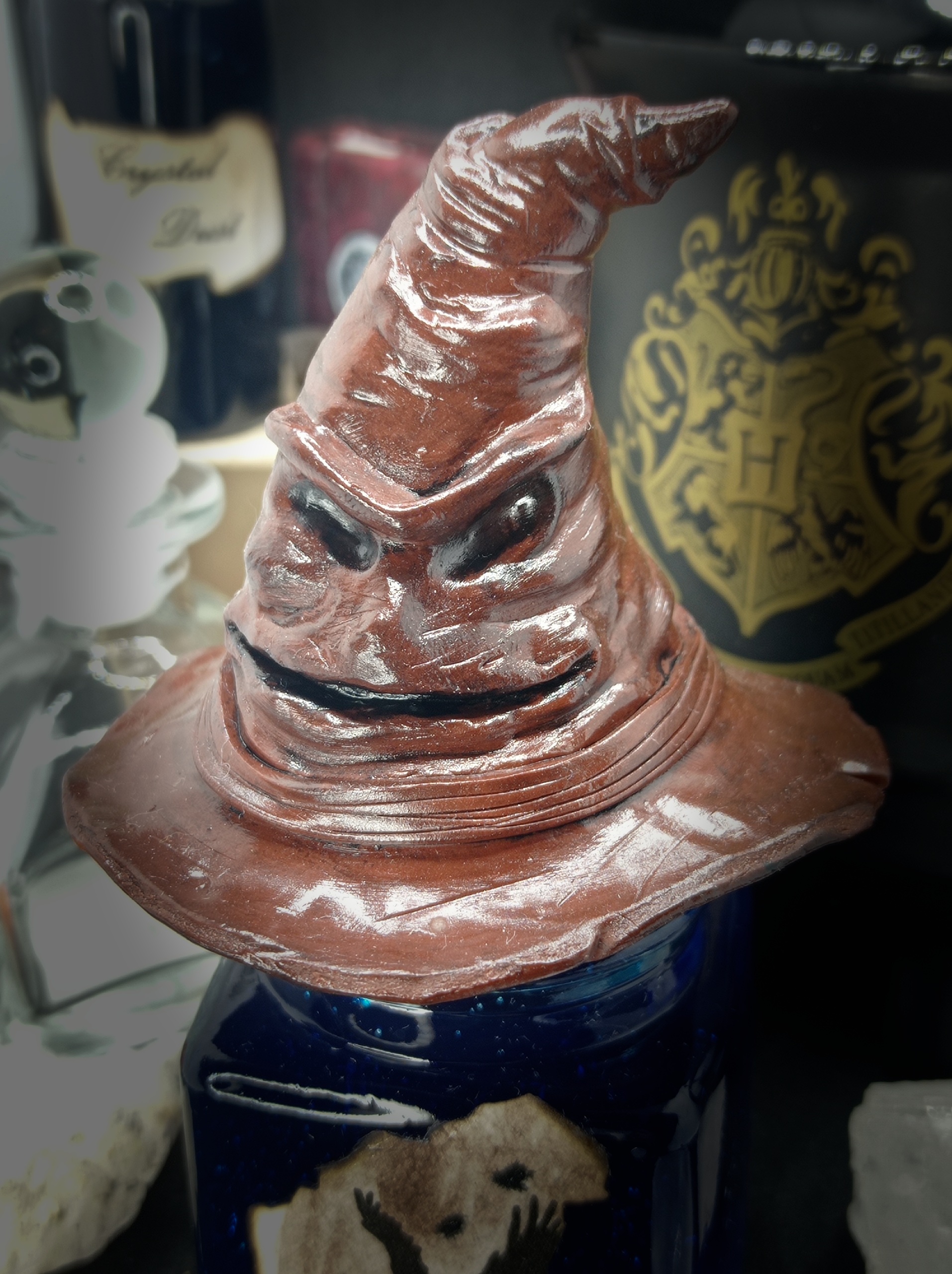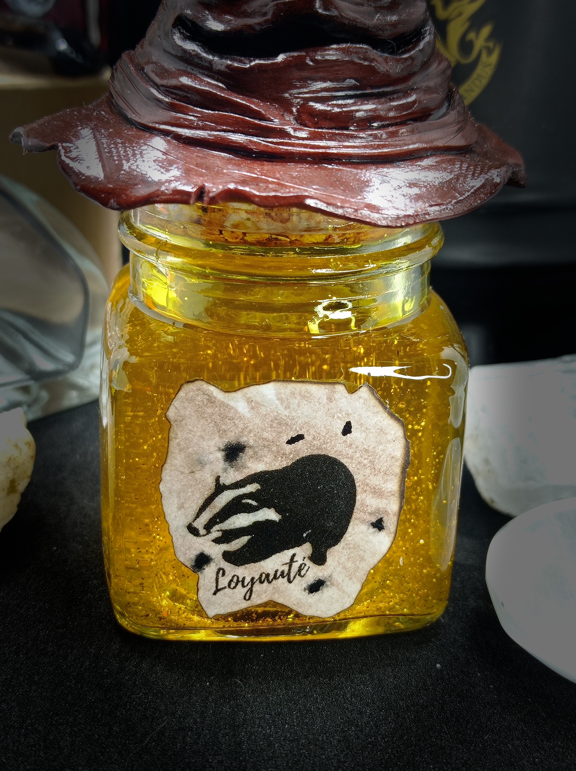 Jolie petite bouteille carrée contenant « une potion pailletée » aux couleurs des maisons de Poudlard! La bouteille est surmontée d’un choixpeau magique sculpté et peint par mes soins.
