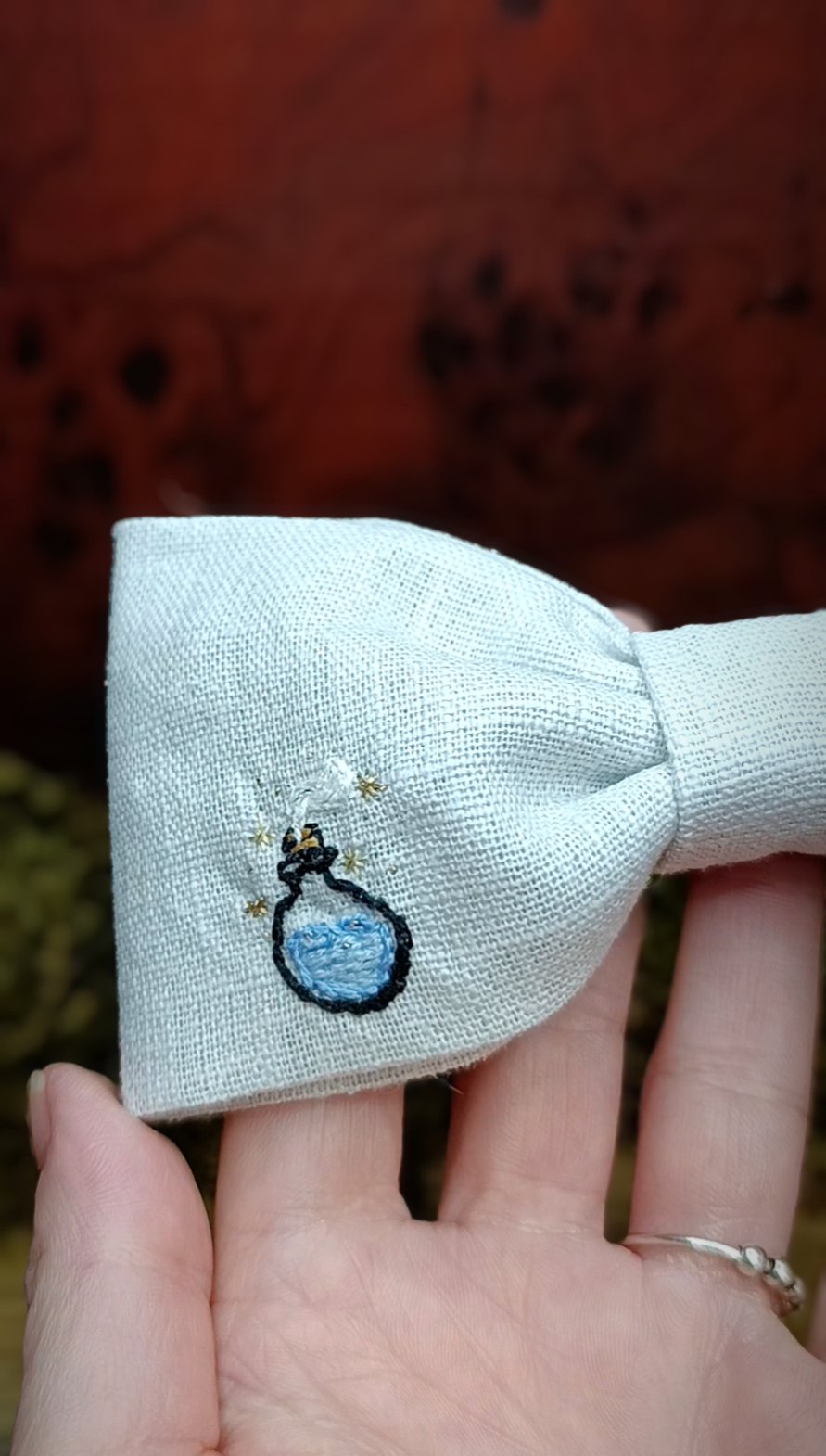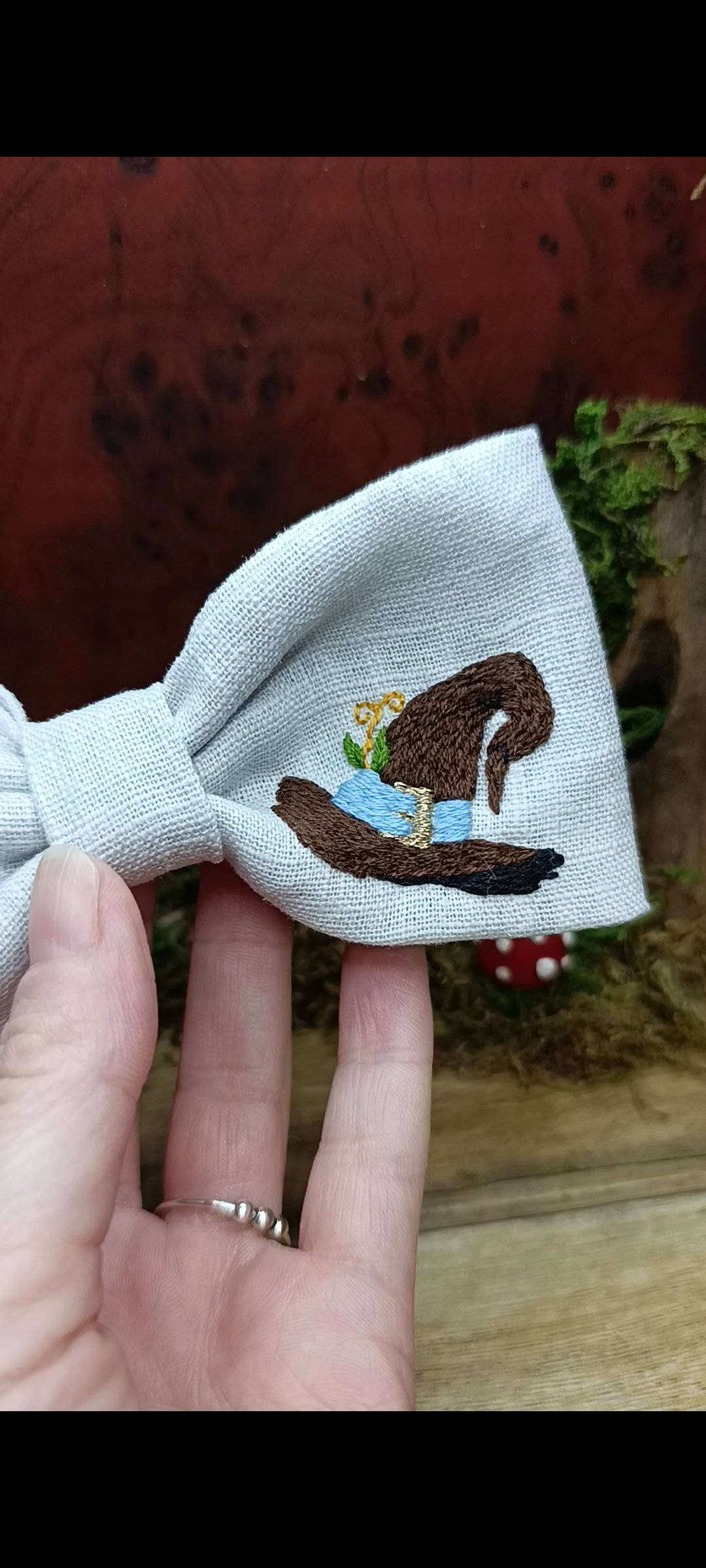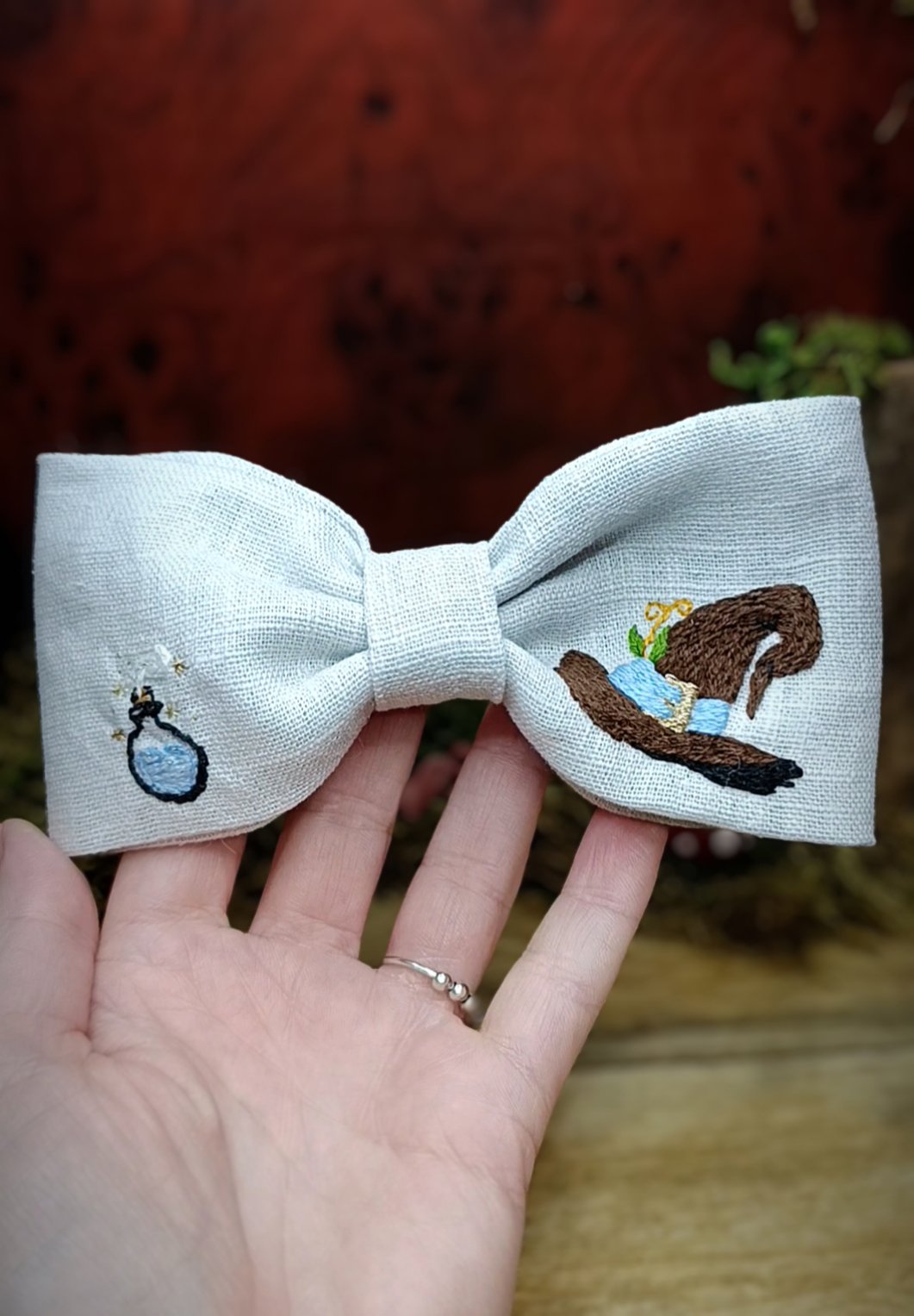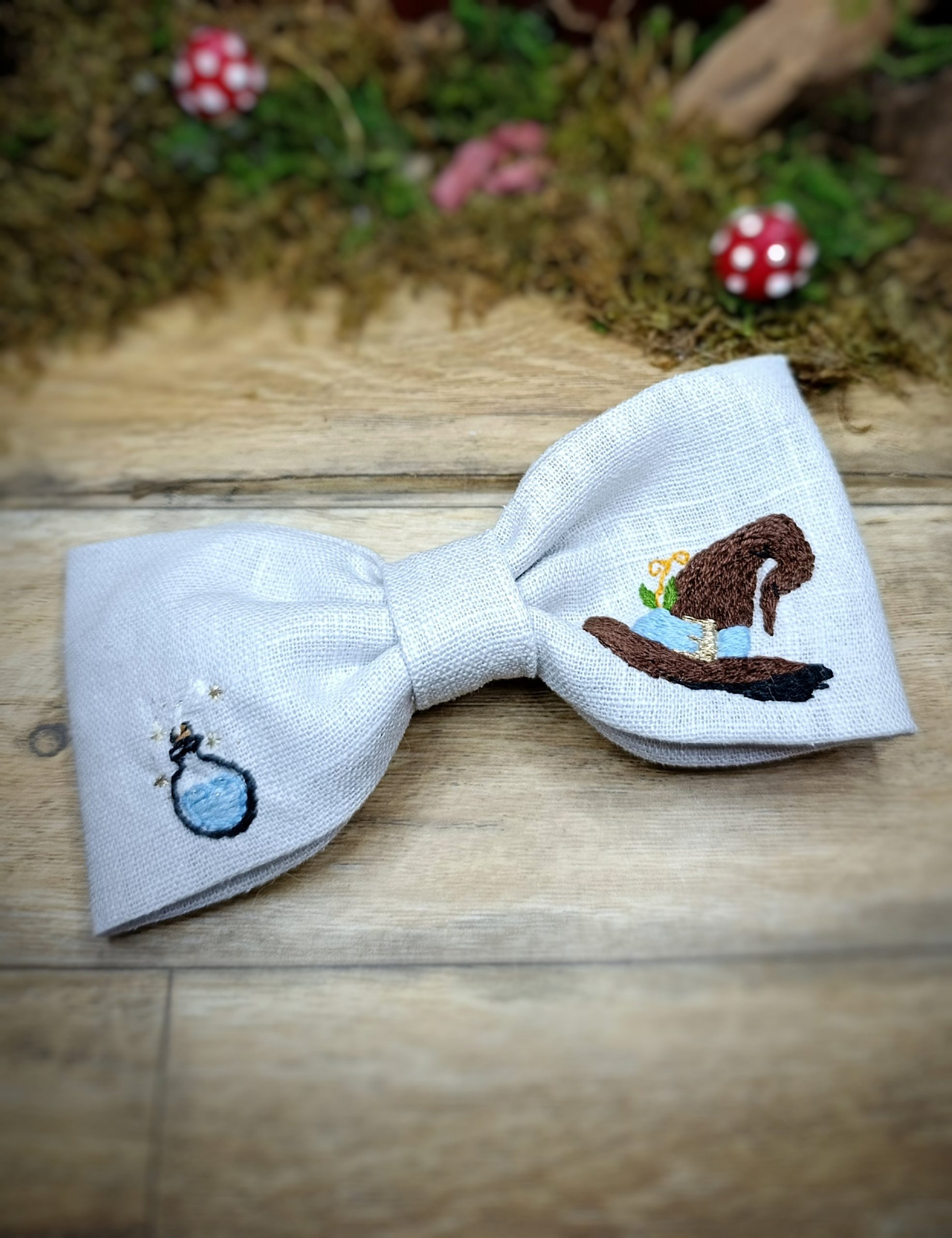 Barrette brodée main – Chapeau de sorcier & fiole magique