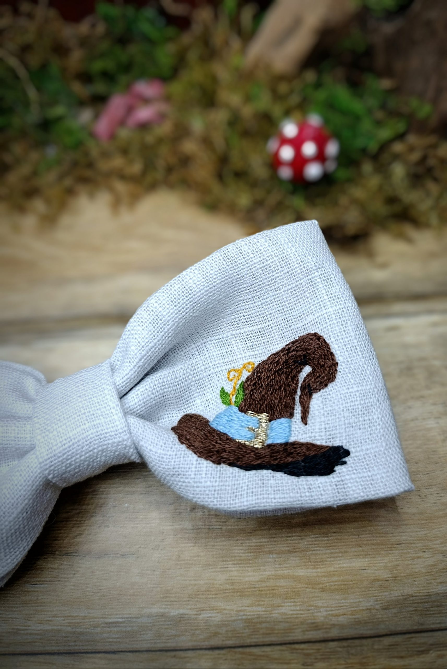 Barrette en tissu brodée et cousue entièrement à la main, représentant un chapeau de sorcier accompagné d’une petite fiole magique.