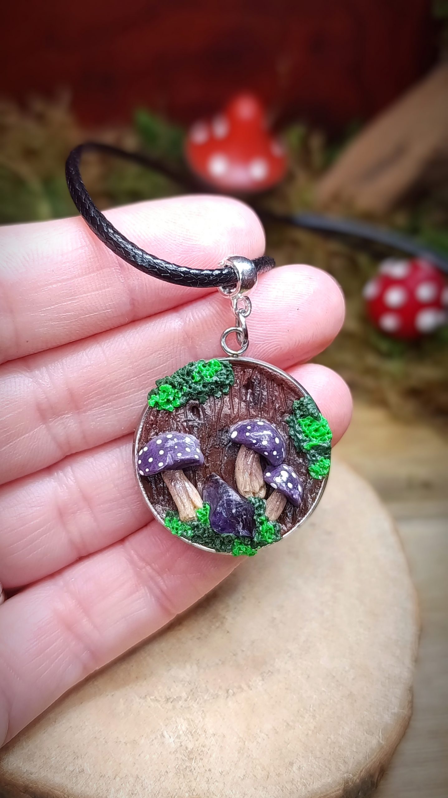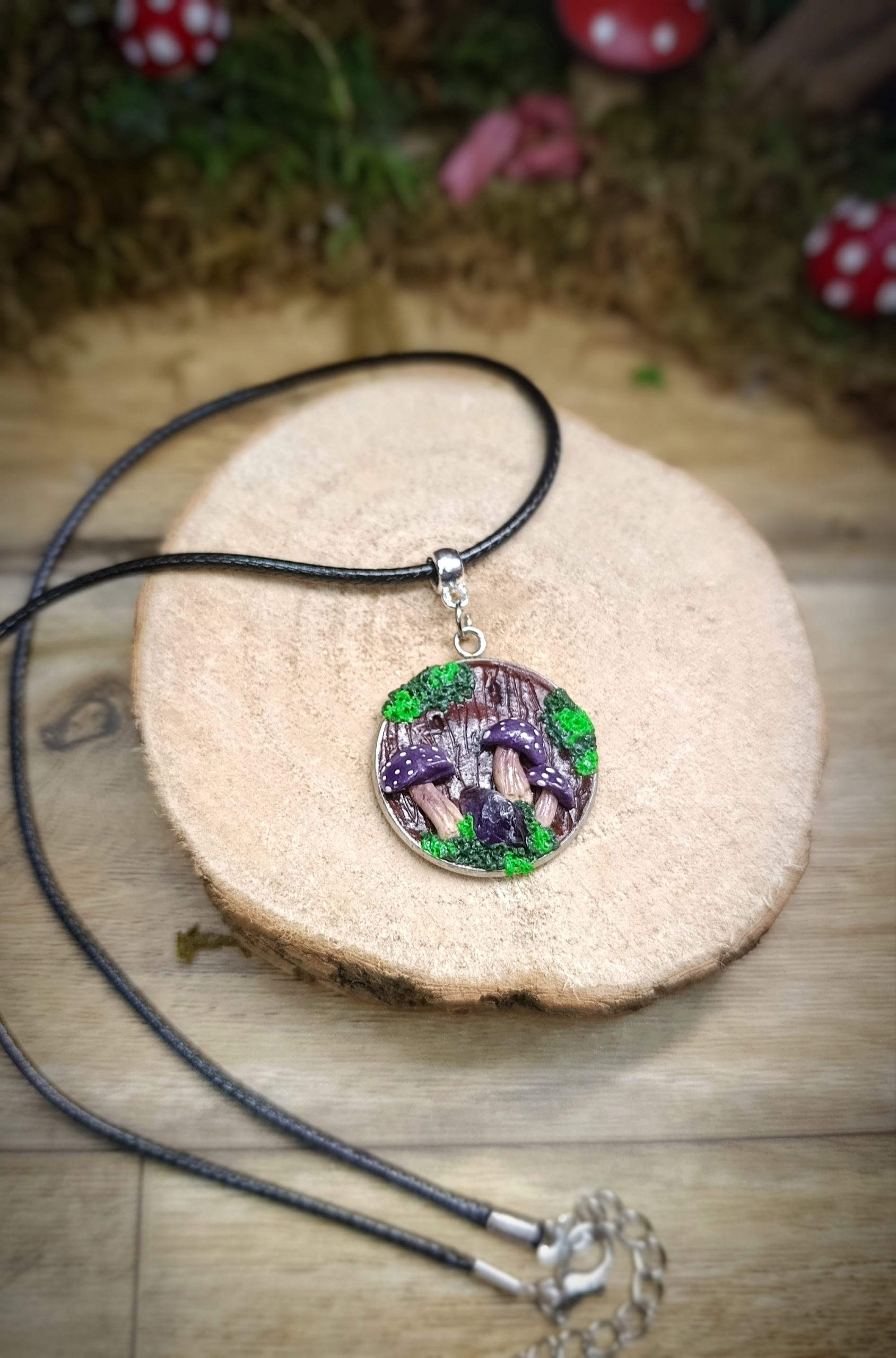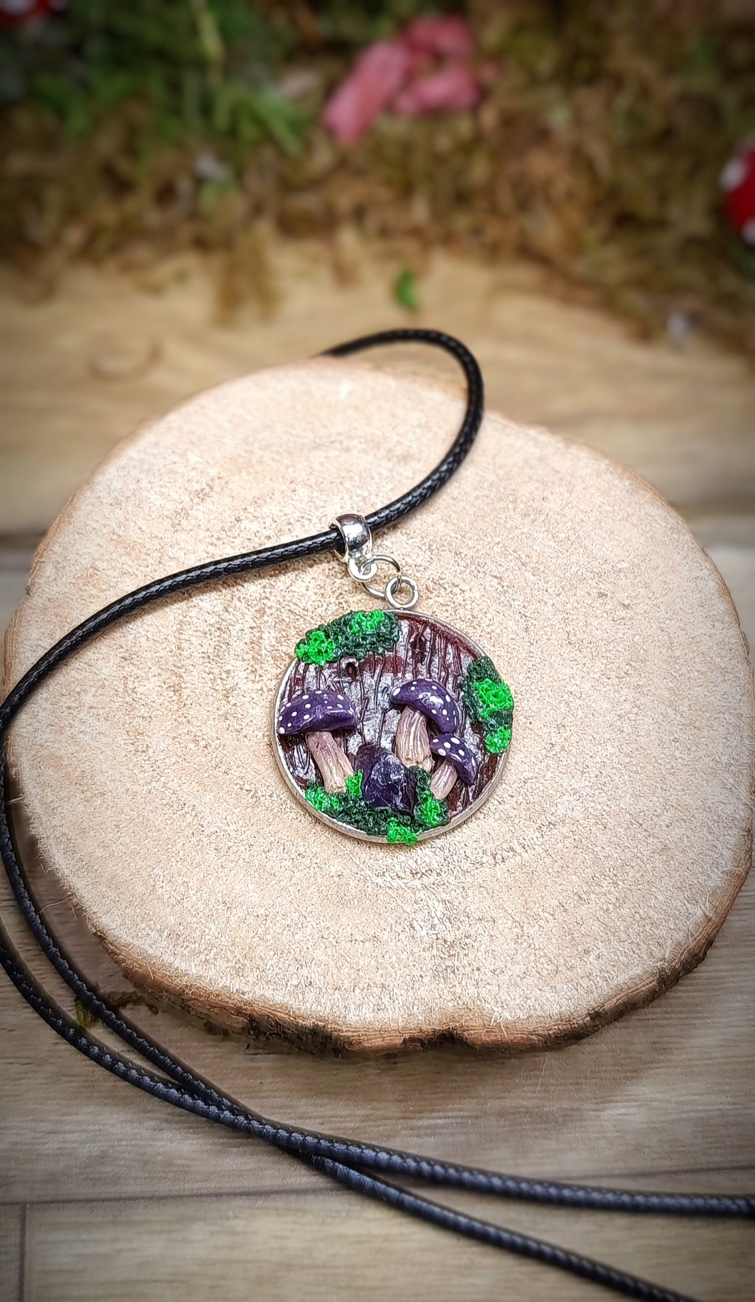 Pendentif entièrement fait main en pâte polymère, inspiré d’un fragment de forêt figé dans le temps.
