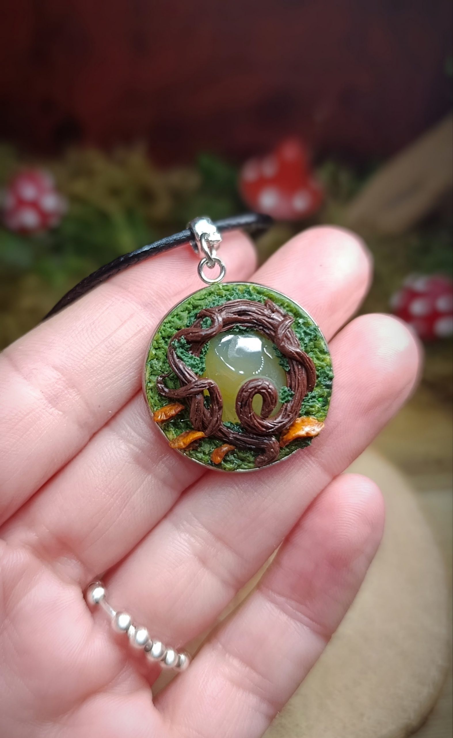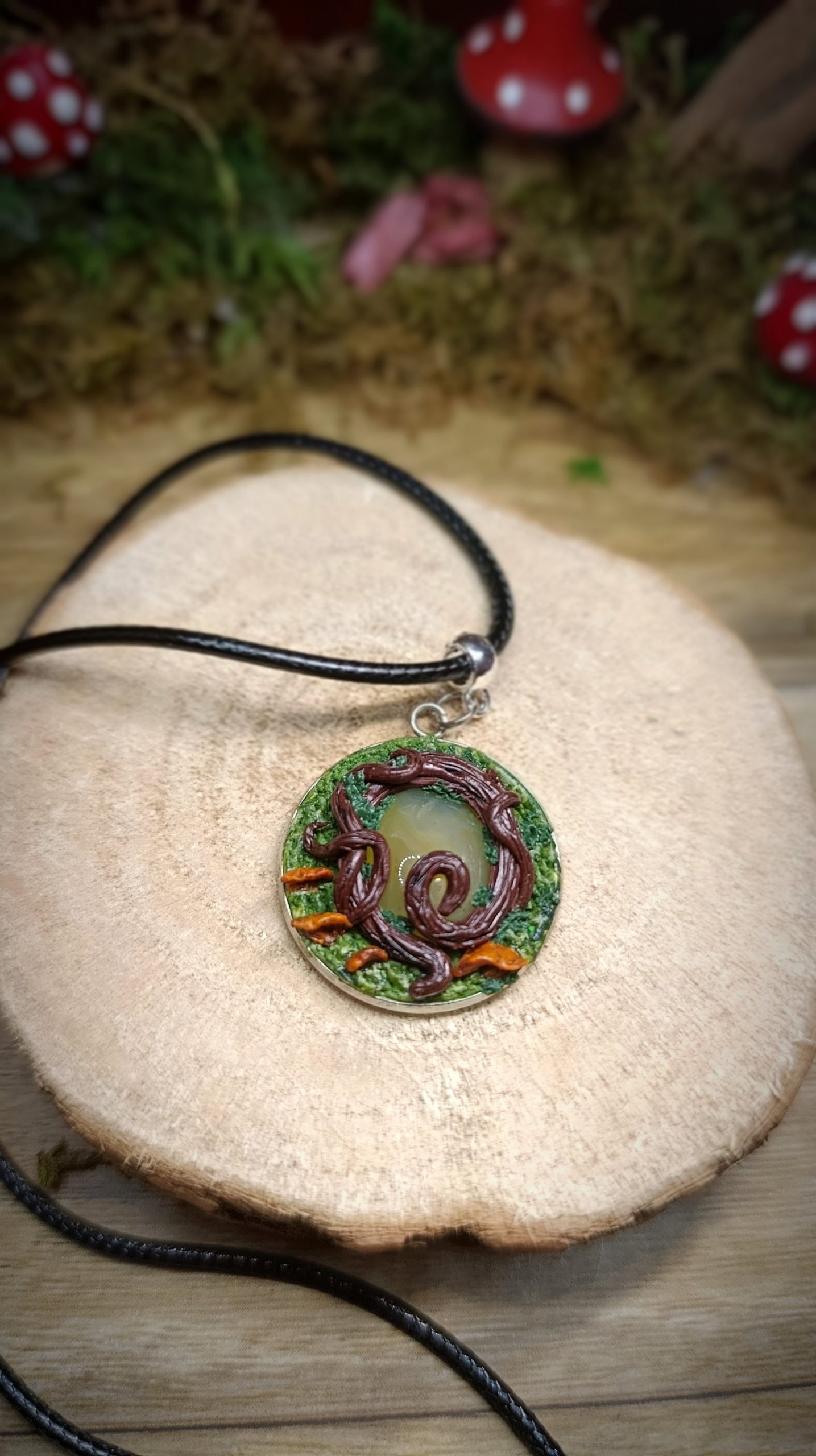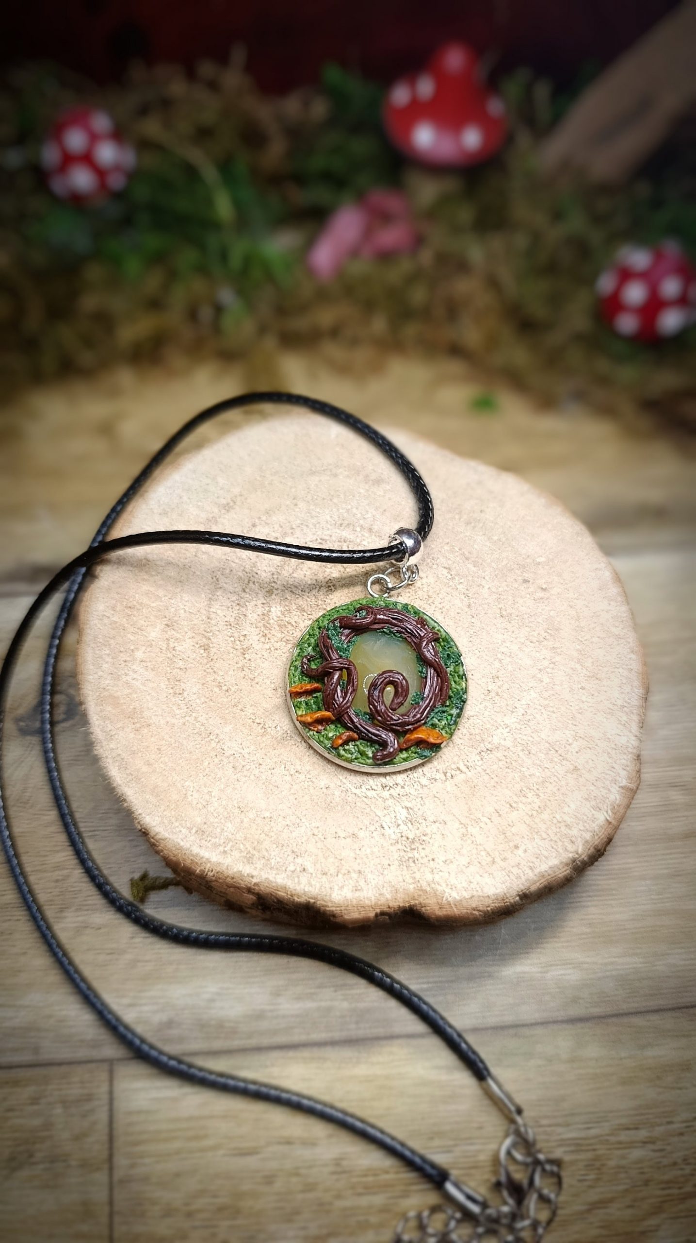 Pendentif entièrement fait main en pâte polymère, inspiré d’un fragment de forêt figé dans le temps.