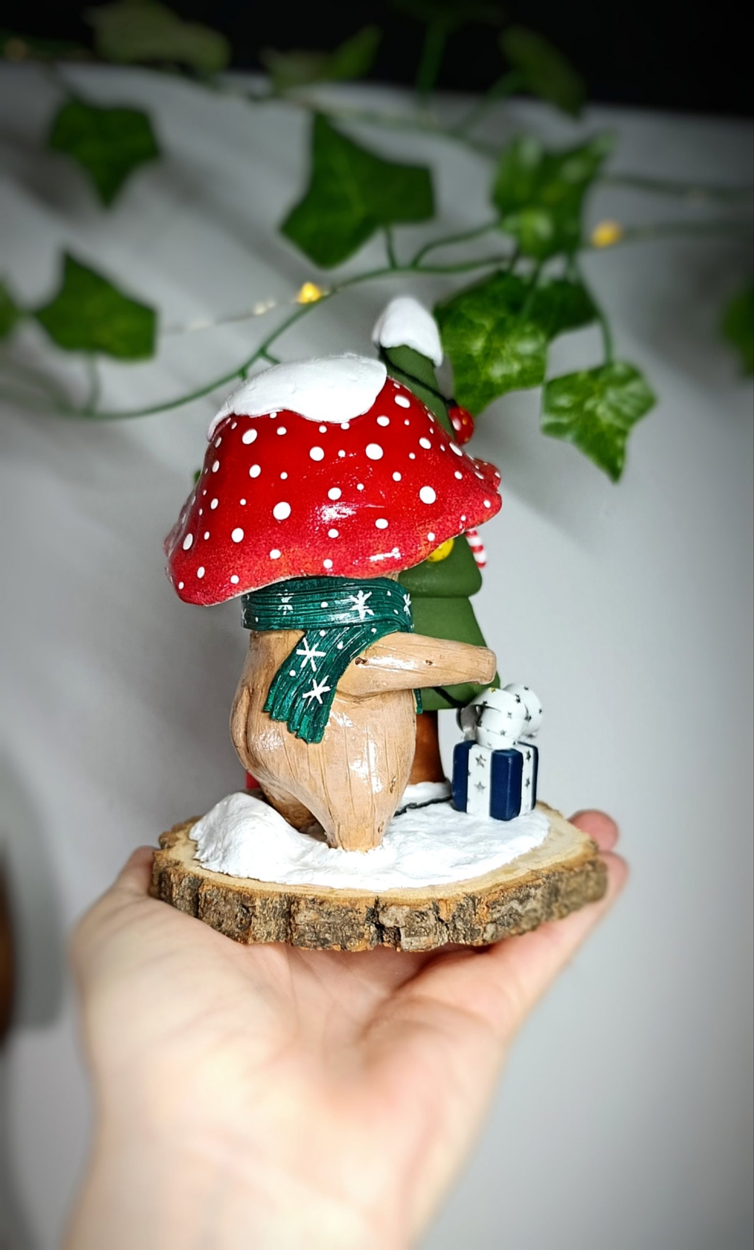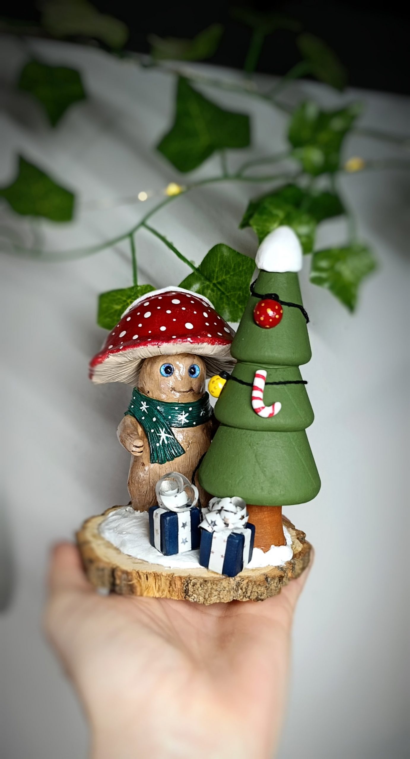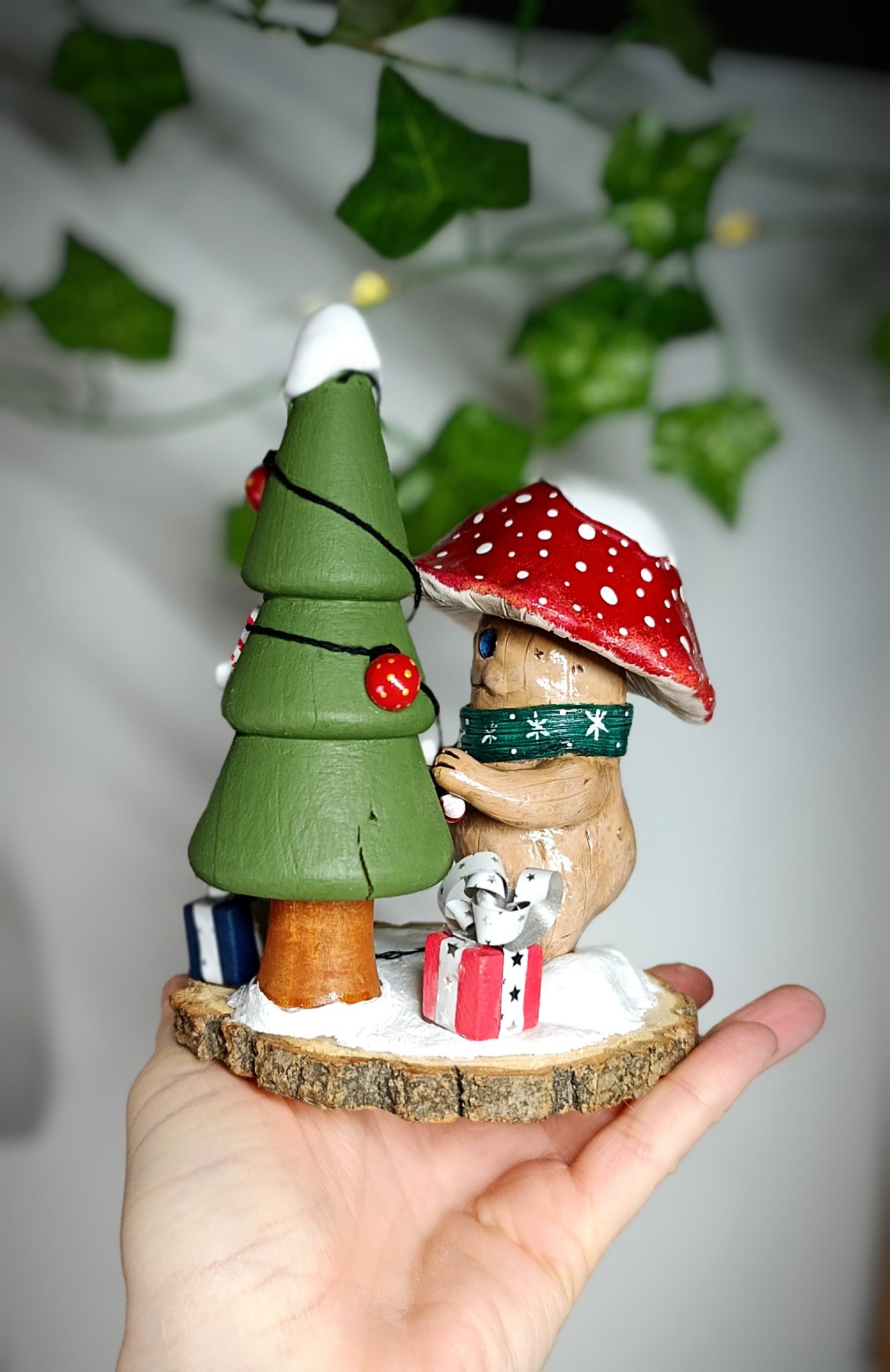 Création artisanale unique entièrement imaginée, sculptée, peinte et vernie par mes soins. À l’exception du sapin et des cadeaux qui sont en bois (peints et vernis par moi même)