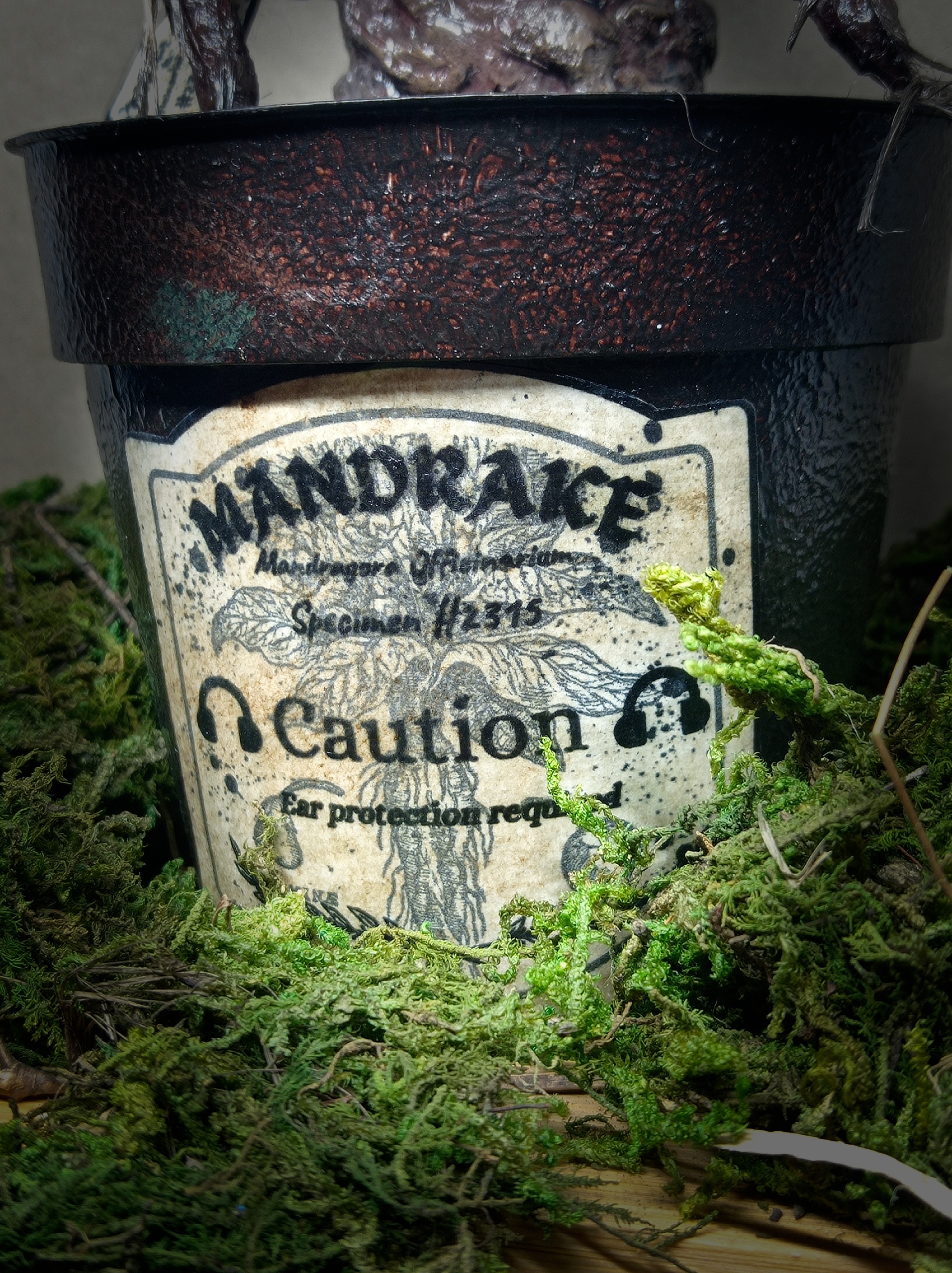 Création entièrement réalisée par mes soins. La mandragore a été sculptée dans de la pâte polymère et peinte avec de la peinture acrylique. Le pot a également était customisé par moi-même à l’aide de différentes techniques et matériaux.