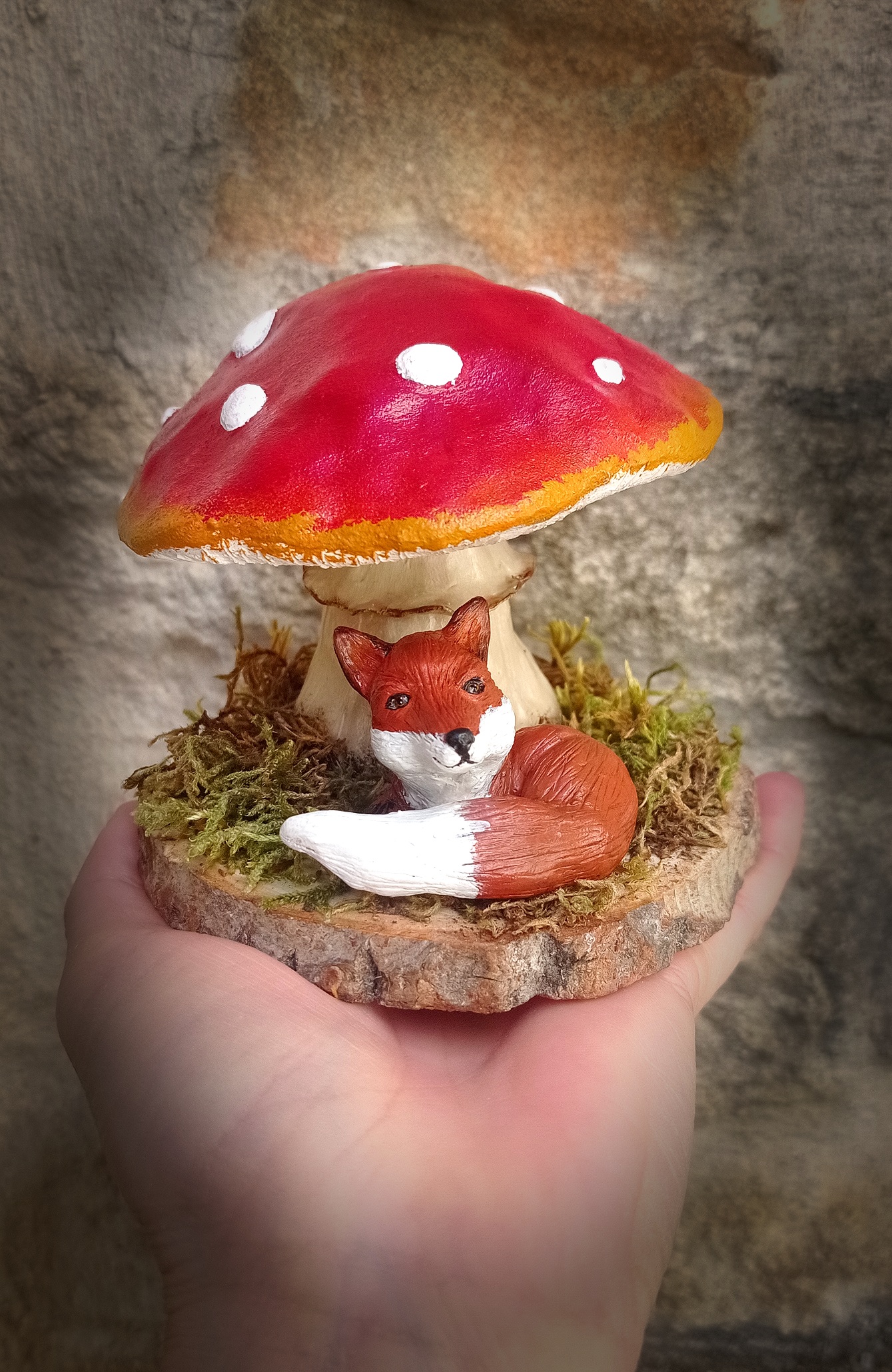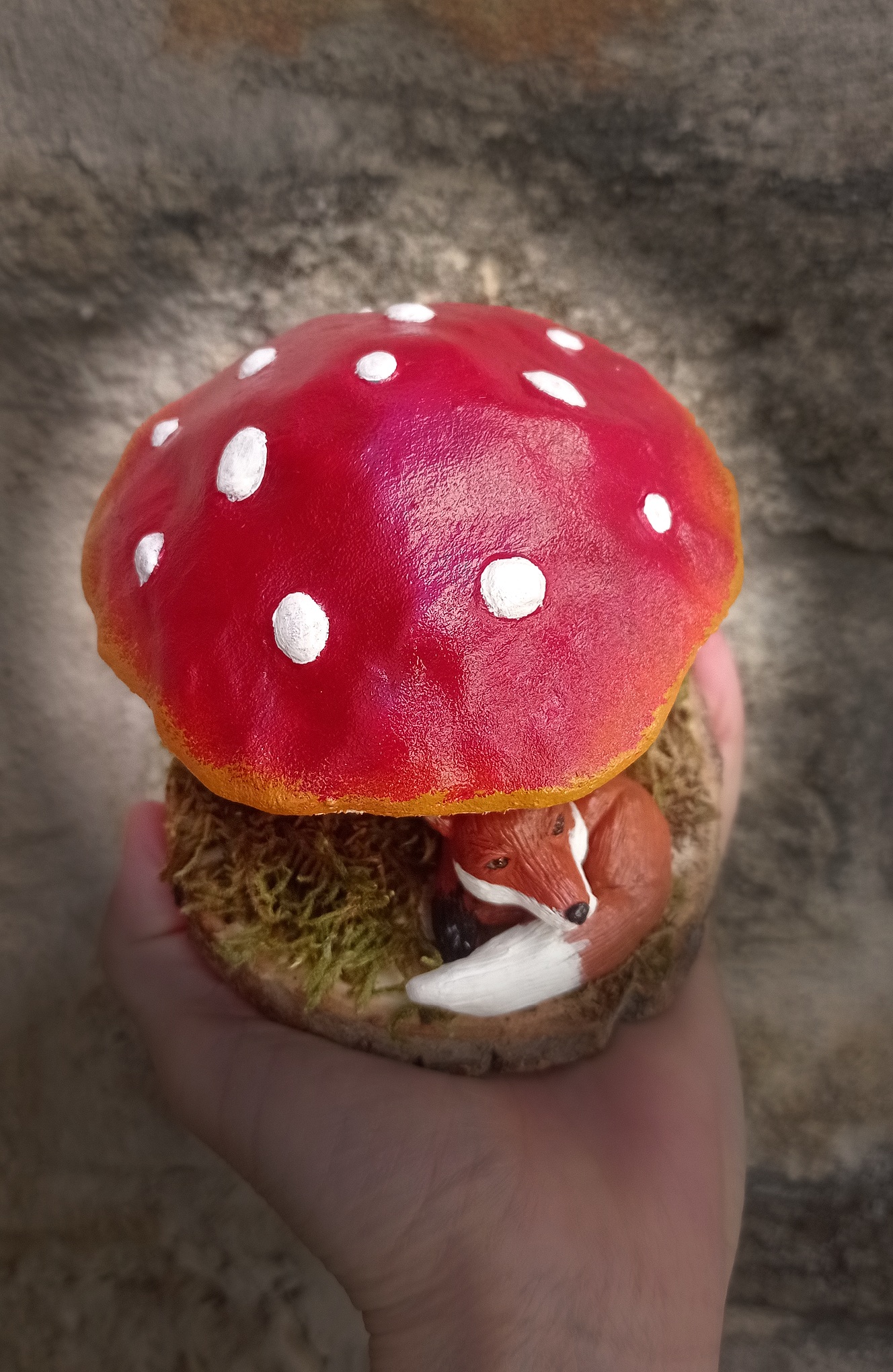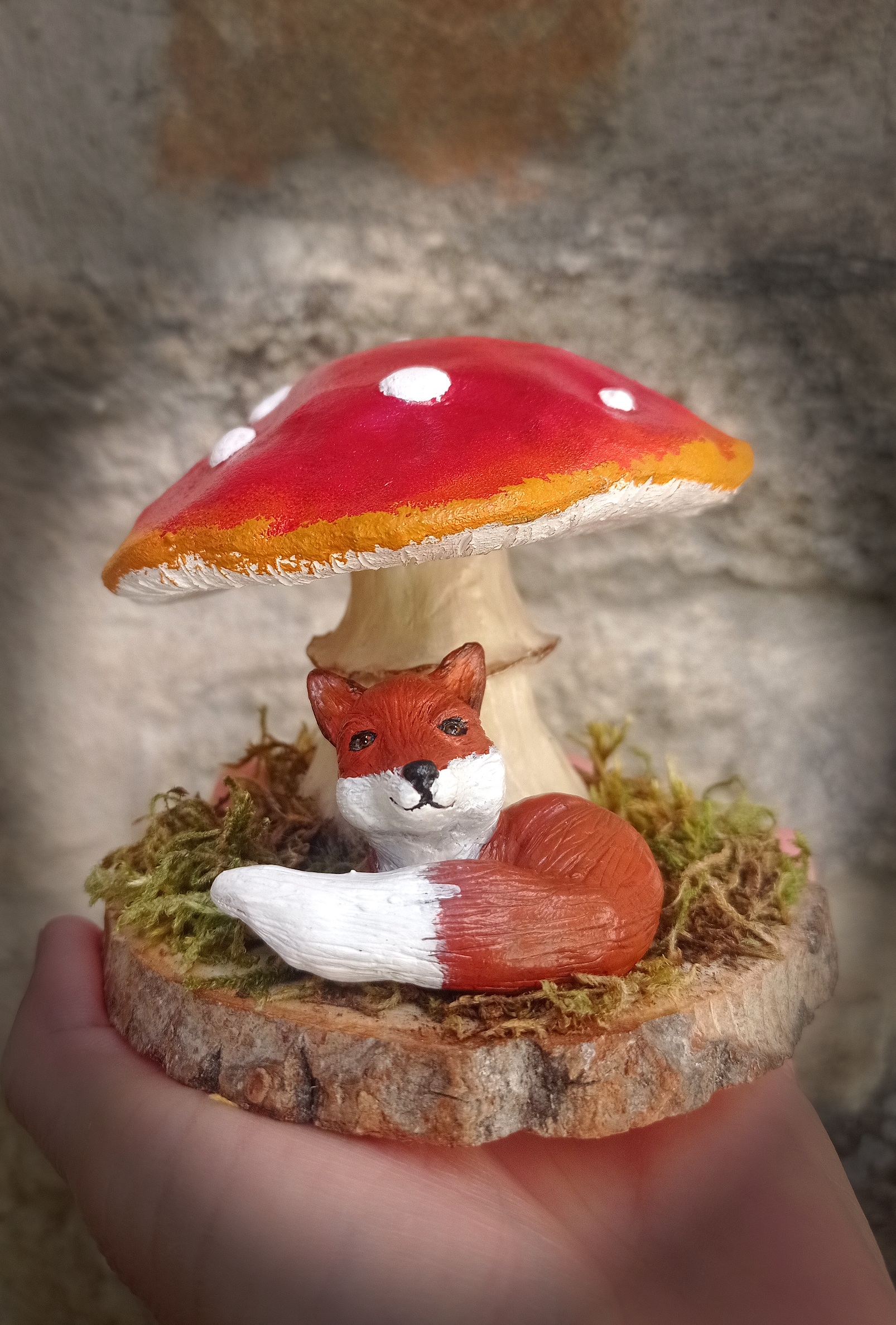 Le renard et le champignon ont été entièrement sculptés dans de la pâte polymère puis peints et vernis par mes soins.